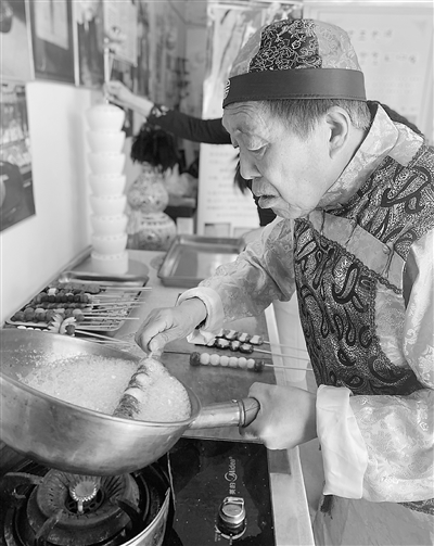 “外皮晶莹剔透,山楂饱满鲜亮,从选料到制作处处皆学问。”如今,满族何记糖葫芦已传至第八代,老手艺代代相传。由于掉地不沾沙、酥脆不粘牙,何记的名声越叫越响。
