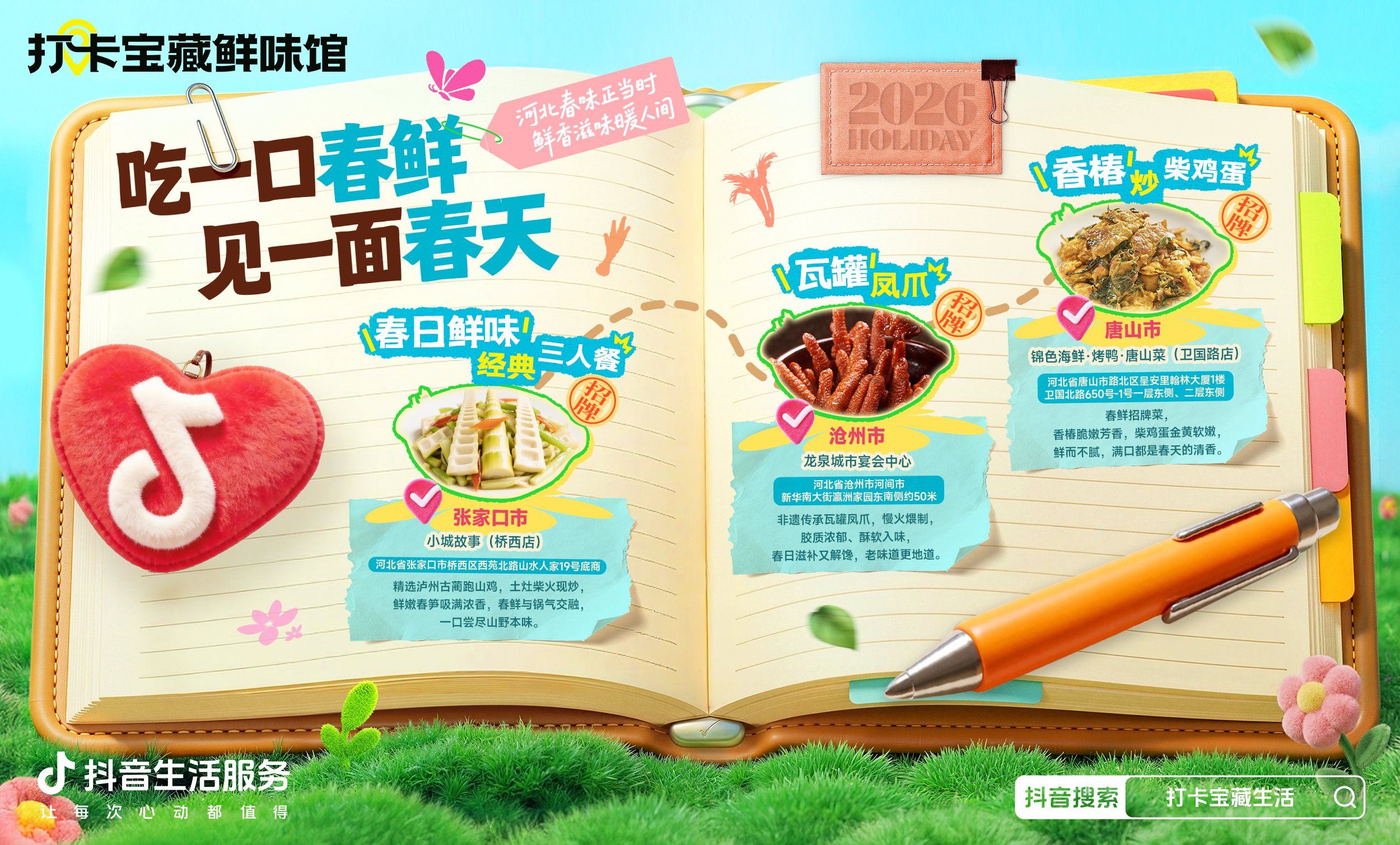 值此春光正好,抖音生活服务于3月22日联合江苏、湖南、四川、河北四地的宝藏小店,正式开启【打卡宝藏生活·宝藏鲜味馆】“尝春鲜”主题活动。今天我们走进街巷深处,用镜头记录那些藏于市井的春日鲜味——带你去吃最地道的河北春天。