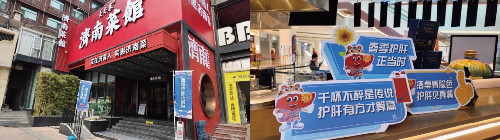 场景延伸,贴近生活。葵花药业联合山东广播电视台、河北青年报等两省头部媒体,将科普触角延伸至酒精肝的实际发生场景——餐饮店。在河北省“渝乡辣婆婆”、山东“城南往事”及其兄弟品牌等社区周边的独立餐饮门店内,通过跨界合作的方式,为当地社区居民提供健康科普,让护肝科普从单向说教转变为场景中的温馨提示,实现“润物细无声”的健康倡导。